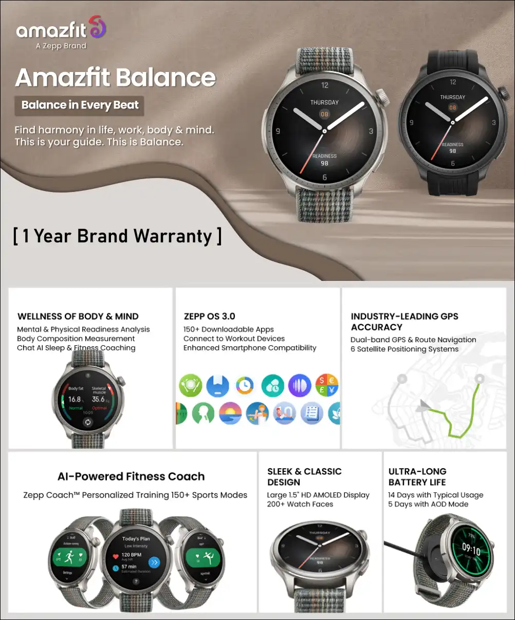 Amazfit Balance BT Calling Smart Watch with Dual-band GPS