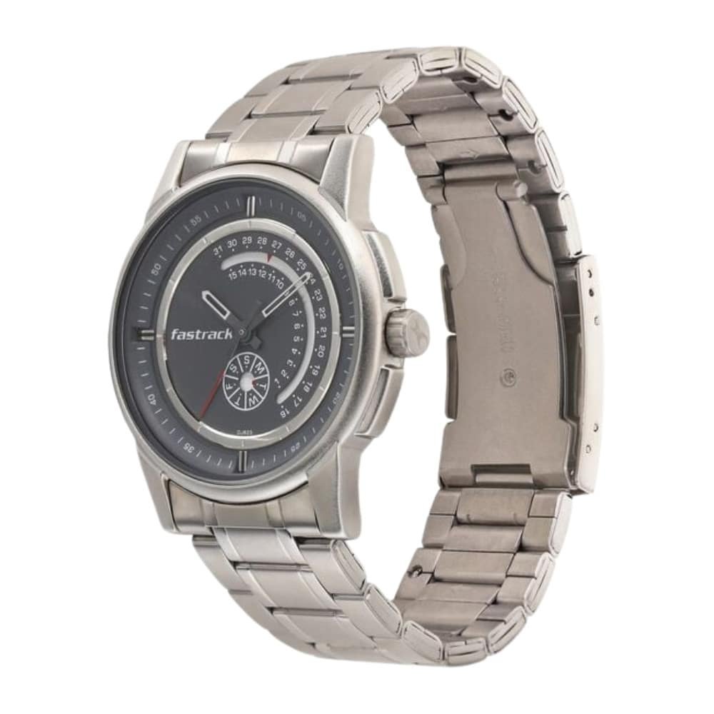 Fastrack Go Skate Quartz Analog with Day and Date White Dial Stainless Steel Strap Watch for Guys NS3215SM01